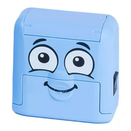 1 kék mosolygós bélyegző (védőtalppal) festékpárnával (fekete textilfestékkel) kb. 1000 lenyomat