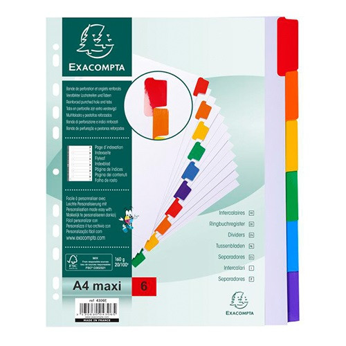 Elválasztólap karton Exacompta A/4 maxi 6 részes fehér, színes laminált regiszterrel
