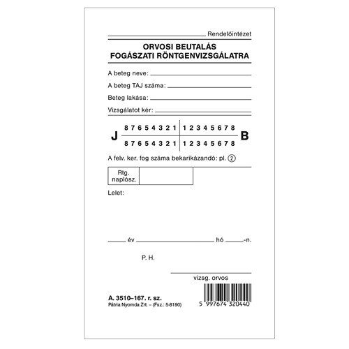 Fogászati beutaló röntgenvizsgálatra szabadlap 85x148 mm
