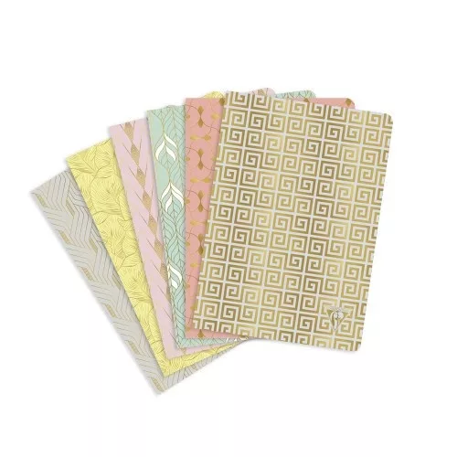 • Geometrikus és organikus minták egy kis arannyal fűszerezve, mely egyedi és elegáns megjelenést kölcsönöz a füzetnek.