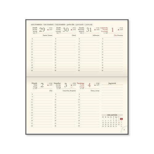 A Period Chamois fekvő zsebnaptár azok számára ideális, akik kompakt méretben keresnek átlátható heti tervezőt. A fekvő kialakítás kényelmes írási felületet kínál, a heti beosztású, 8–17 órás felosztás pedig egyszerűvé teszi a mindennapi találkozók és feladatok rendszerezését. A körbevarrott műbőr borító elegáns és tartós, míg a cérnafűzött kötés és a sarokperforáció a kényelmes, megbízható mindennapi használatot szolgálják.