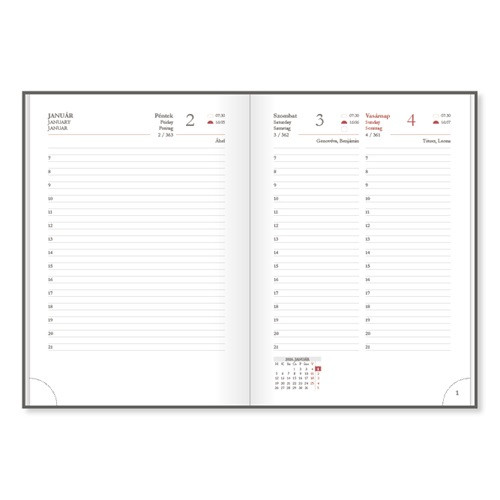 • Oldalszám: 352 oldal – 16 információs oldal, 320 naptároldal, jegyzetek, telefonregiszter, 2027. januári tervező