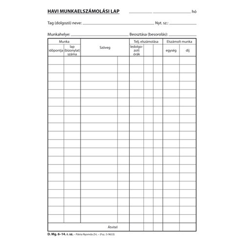 Havi munkaelszámolás szabadlap A/4 fekvő