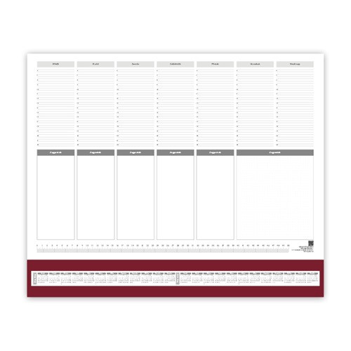 A 59×41 cm-es könyöklő ideális irodai és adminisztratív környezetbe, ahol a hatékony tervezés és a letisztult megjelenés kéz a kézben jár. A praktikus heti beosztás és a jegyzetmezők gyors áttekintést biztosítanak, míg a színes műbőrcsík elegáns, egységes megjelenést kölcsönöz az íróasztalnak. A minőségi papír és a stabil felület biztosítja a gördülékeny írásképet és a hosszú távú használhatóságot.