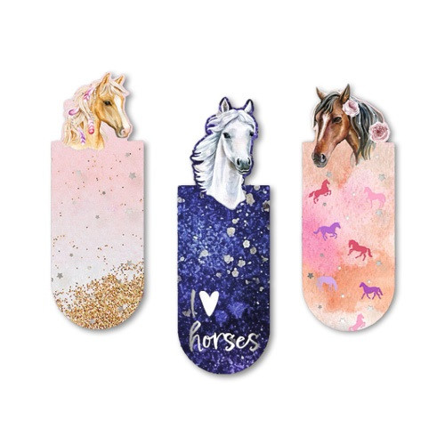 Ez a szett három divatos és életvidám témájú mágneses könyvjelzőt tartalmaz, amelyek tökéletesek a könyvek szerelmeseinek. A könyvjelzők különböző lovas mintákkal díszítettek: az egyik egy tollakkal ékesített sörényű ló fejét ábrázolja rózsaszín háttérrel, a másik egy csillagos éjszakai égboltot “I Horses” felirattal, a harmadik pedig egy ló fejét virágokkal a sörényében. A fém fólia díszítés finom csillogást biztosít a könyvjelzőknek, ami tovább emeli azok szépségét.