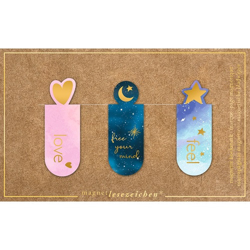 Ez a szett három divatos és életvidám témájú mágneses könyvjelzőt tartalmaz, amelyek tökéletesek a könyvek szerelmeseinek. A könyvjelzők különböző inspiráló mintákkal díszítettek: az egyik rózsaszín háttérrel és “love” felirattal, a másik sötétkék háttérrel, csillagokkal és “free your mind” felirattal, a harmadik pedig kék-lila átmenetes háttérrel és “feel” felirattal. Ezek a színes és pozitív témájú könyvjelzők feldobják az olvasás élményét.