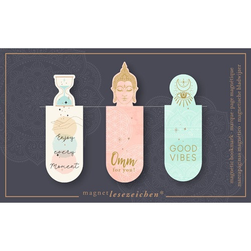 Ez a szett három divatos és életvidám témájú mágneses könyvjelzőt tartalmaz, amelyek tökéletesek a könyvek szerelmeseinek. A könyvjelzők különböző inspiráló mintákkal díszítettek: az egyik homokórát ábrázol csillagokkal és az “Enjoy every moment” felirattal, a másik egy Buddha fejet “Omm for you!” felirattal, a harmadik pedig égi motívumokat, mint a nap, hold és csillagok, valamint a “GOOD VIBES” feliratot tartalmaz. Ezek a színes és pozitív témájú könyvjelzők feldobják az olvasás élményét.