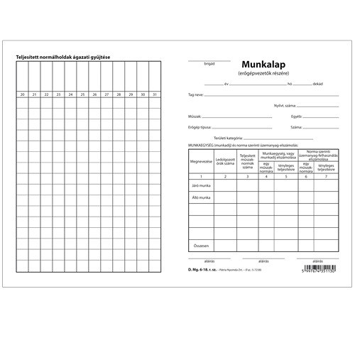 Munkalap erőgépvezetők részére szabadlap A/5 álló