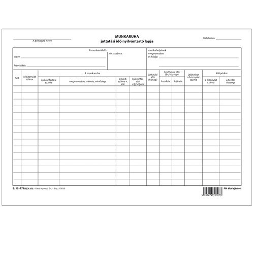 Munkaruha juttatási idő nyilvántartó lap A/4 fekvő