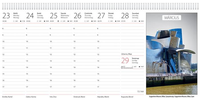 Minden irodában nélkülözhetetlen. Senki sem vitathatja, hogy az asztali naptárak az irodavilág egy leghasznosabb segítői. Ha Önnek fontos a pontosság, az időpontok betartása és ezáltal az ügyfelek elégedettsége, akkor a cég egyik asztaláról sem hiányozhatnak ezek a tervező alkalmatosságok. -időbeosztás: félórás, 8-17.00 h -magyar-angol-német nyelvű naptárháló -névnapok, magyar ünnepek és hasznos információk minden napra -extra sorok a munkaidőn túli események feljegyzésére -elegáns fém ikerspirál a szebb megjelenésért -magyar-angol nyelvű képleírások -válogatott színes képek minden hétre -méret: 320x150 mm -reklámfelület: 320x40 mm -27 lap -12 kép -lap típusa 115 g/m2, fehér ofszet