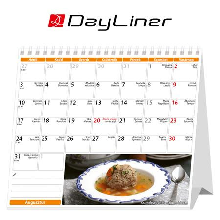 Minden irodában nélkülözhetetlen. Senki sem vitathatja, hogy az asztali naptárak az irodavilág egyik leghasznosabb segítői. Ha Önnek fontos a pontosság, az időpontok betartása és ezáltal az ügyfelek elégedettsége, akkor a cég egyik asztaláról sem hiányozhatnak ezek a tervező alkalmatosságok. -naptárbeosztás: havi (1 hónap 1 lapon) -magyar nyelvű naptárháló -névnapok, magyar ünnepek -extra sorok a munkaidőn túli események feljegyzésére -elegáns fém ikerspirál a szebb megjelenésért -méret: 150x130 mm -15 lap -12 színes képpel és 12 recepttel, jegyzetlappal