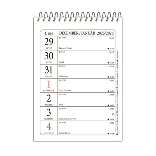 A pd asztali naptára letisztult designnal és praktikus elrendezéssel segíti a mindennapi időbeosztást. Álló formában, 100×140 mm-es méretben kínál 54 oldalas terjedelmet, amely heti beosztással és esztétikus kivitelben szolgál. A spirálozott kötés és a minőségi anyagok tartós használatot biztosítanak.