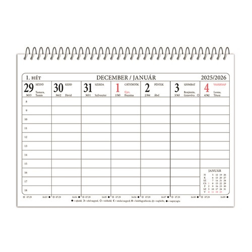 • Naptárbeosztás: heti beosztás, 8-18 óra közötti időbeosztás, magyar név- és ünnepnapok, hónapáttekintő, holdfázisok, eltelt/hátralévő napok száma