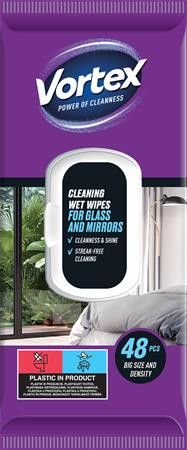 Nedves törlőkendő, üveg- és tükör felületre, visszazárható tetővel, 48 db, VORTEX