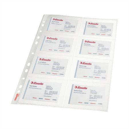 - névjegyek tárolására és rendszerezésére alkalmas lefűzhető tasak - lyukak száma: 11 - felület: víztiszta - nyitott oldal: oldalt - kapacitás: 8 névjegy/oldal - 16 névjegy/tasak