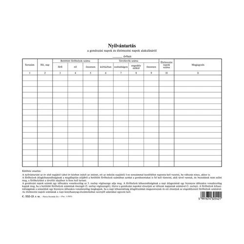 Nyilvántartás a gondozási napok és élelmezési napok alakulásáról szabadlap A/4 álló