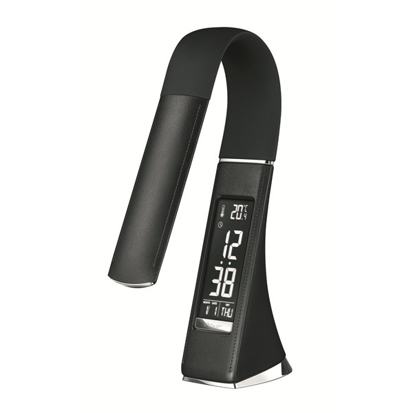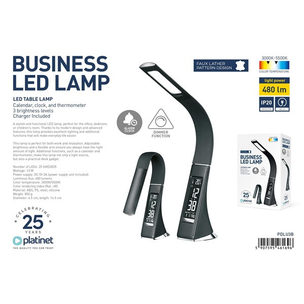 PLATINET Asztali lámpa 9W, rugalmas, hajlítható, LCD digitális naptárral, órával és hűmérővel, 5500K, 480Lm, fekete