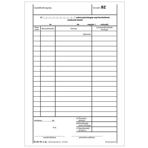 Pénztárgép napi bevételének módosító tételei 25x2 lapos tömb A/5 álló