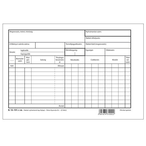 Raktári nyilvántartó lap (fejlap) kicsi A/5 fekvő