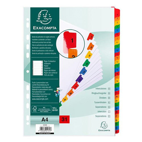 Regiszter karton Exacompta A/4 31 részes fehér, színes laminált fülekkel