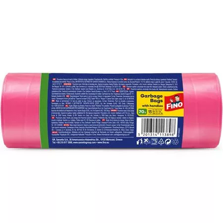 Szemeteszsák, köthető füles, illatosított, 70 l, 15 db, 62x73 cm, 16 µ, FINO "Premium handles", rózsaszín