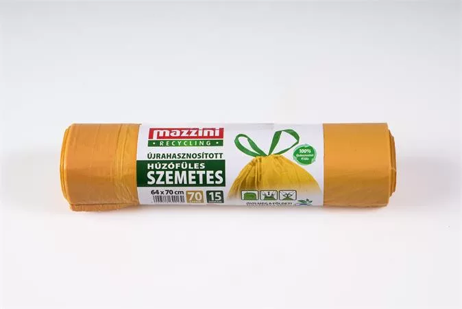 Szemeteszsák, újrahasznosított, húzófüles, 70 l, 15 db, 64x70 cm, 18 µ, MAZZINI, sárga