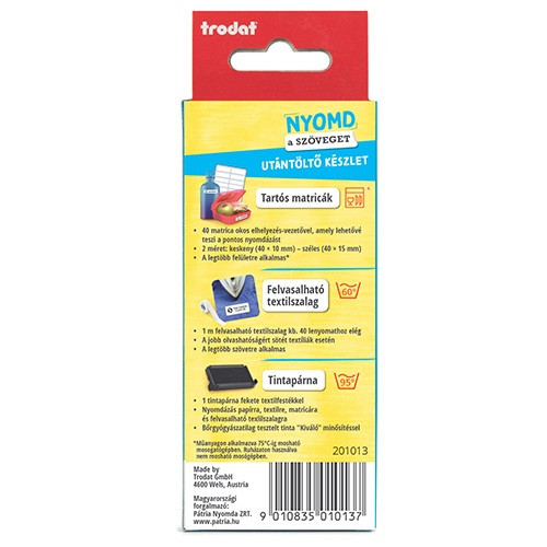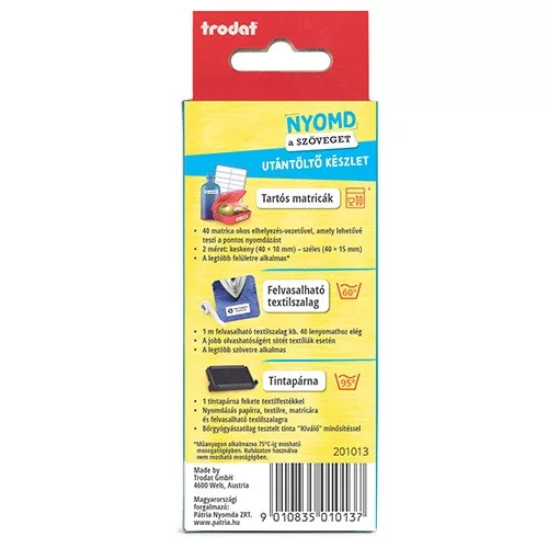 • A készlet tartalmaz: 40 db matricát (kétféle méretben) és 1 méter felvasalható textilszalagot, 1 db tintapárnát.
