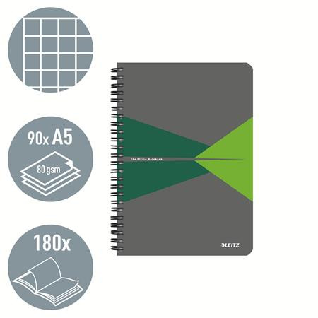 Spirálfüzet, A5, kockás, 90 lap, laminált karton borító, LEITZ "Office", szürke-zöld