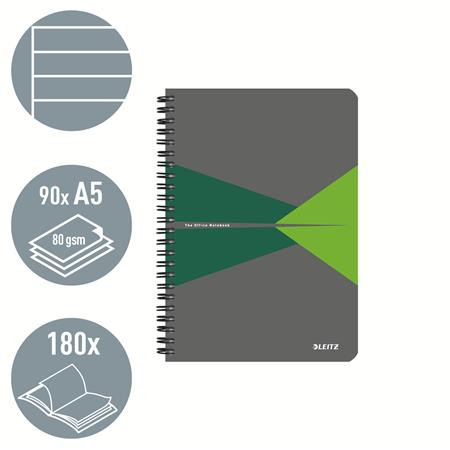 Spirálfüzet, A5, vonalas, 90 lap, laminált karton borító, LEITZ "Office", szürke-zöld