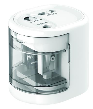 Hegyező, kétlyukú, asztali, elemes, USB töltővel, RAPESCO"PS12-USB", fehér