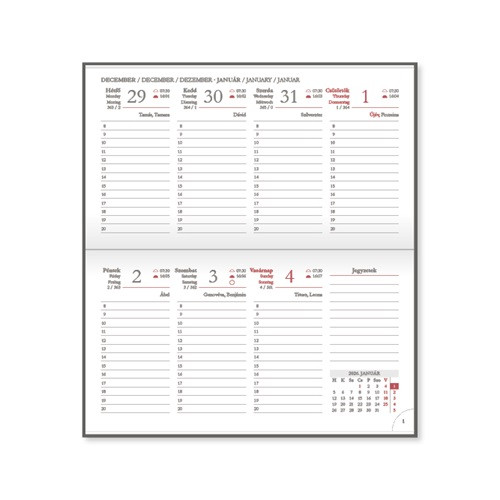A Period Border fekvő zsebnaptár ideális választás azoknak, akik a heti tervezést kompakt, mégis jól áttekinthető formában keresik. A fekvő kialakítás kényelmes írási felületet biztosít, a heti bontású, 8–17 órás beosztás pedig megkönnyíti a találkozók és feladatok rendszerezését. A körbevarrott műbőr borító elegáns és tartós, míg a cérnafűzött kötés és a sarokperforáció hosszú távon is megbízható használatot nyújt.
